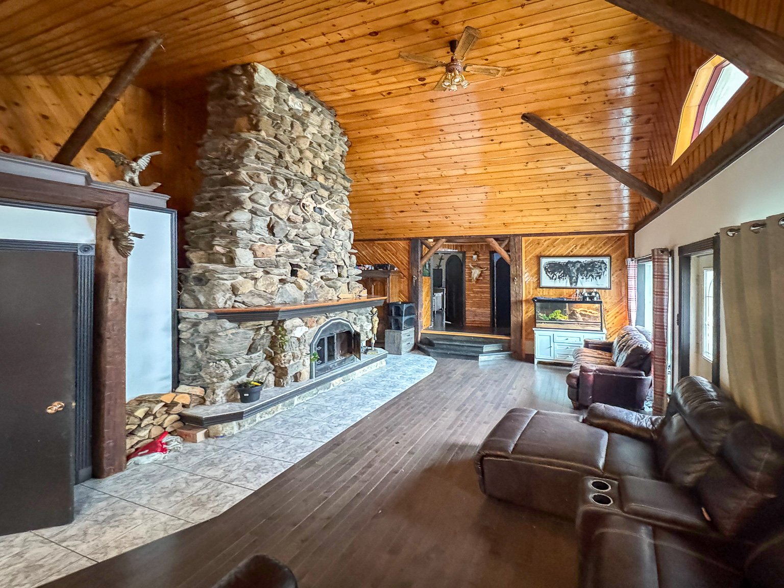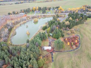 Domaine unique de ±20 acres à Coaticook : vaste propriété au cachet rustique, implantée au bord d'un lac artificiel privé avec îlots et ceinture d'arbres matures. La maison est spacieuse et lumineuse, offre un spectaculaire plafond cathédrale en bois, un immense foyer de pierre au salon et une cuisine conviviale avec grand îlot, comptoirs de pierre et four(s) encastré(s). Sur le site : chalet avec droit acquis, 2 garages, un hangar et un moulin (voir photos). Allée privée, ambiance de parc et intimité totale -- parfait pour un domaine familial, villégiature ou atelier d'artiste. La maison demande un rafraîchisse